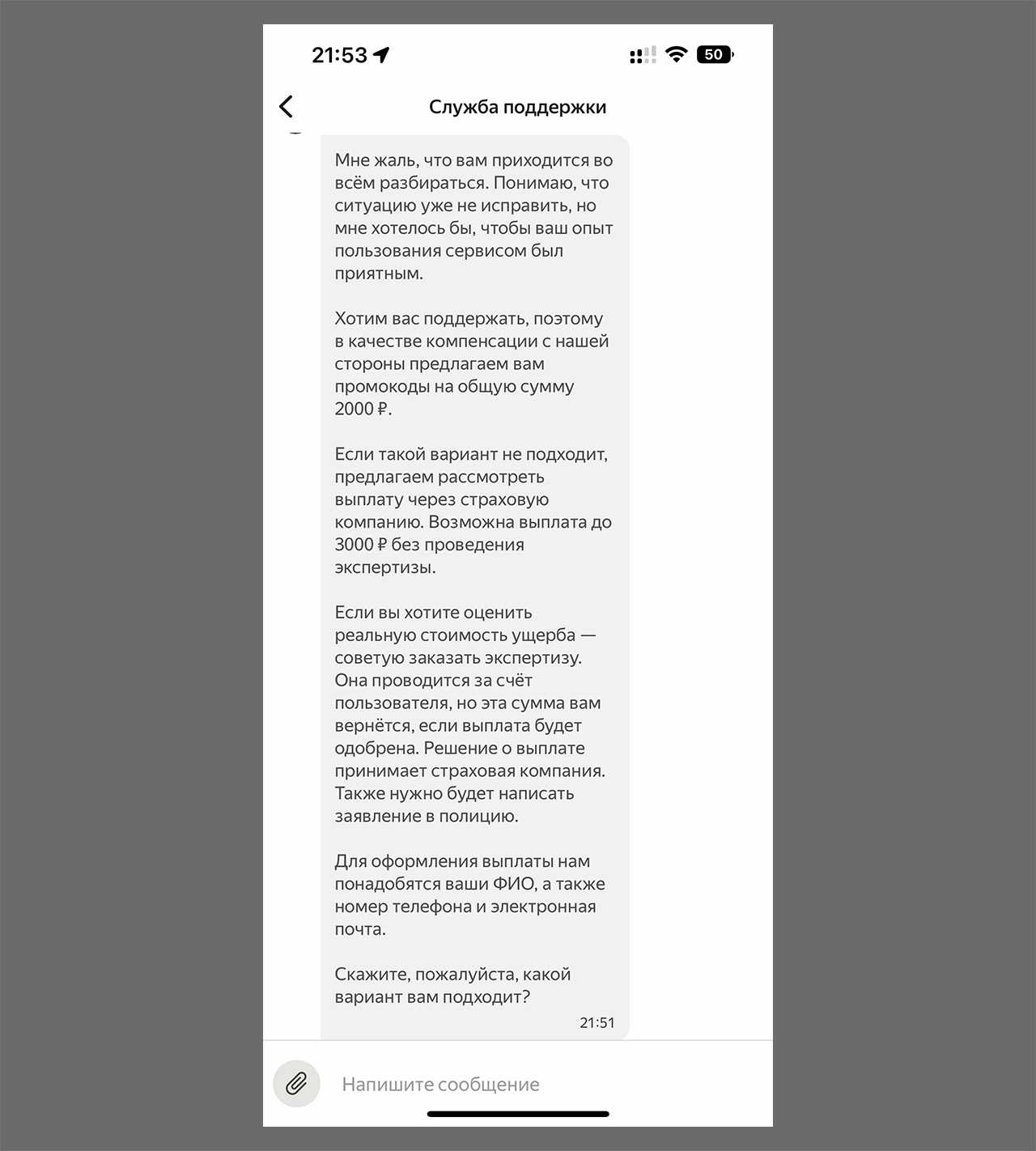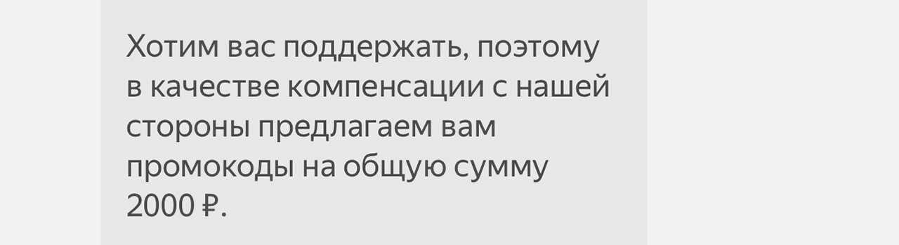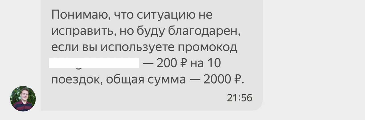 А далее произошло следующее: я сразу же попросил не предлагать мне промо-код на 200 рублей, как обычно делают сотрудники техподдержки при проблемах с таксистами, и что бы вы думали мне предложил оператор техподдержки?