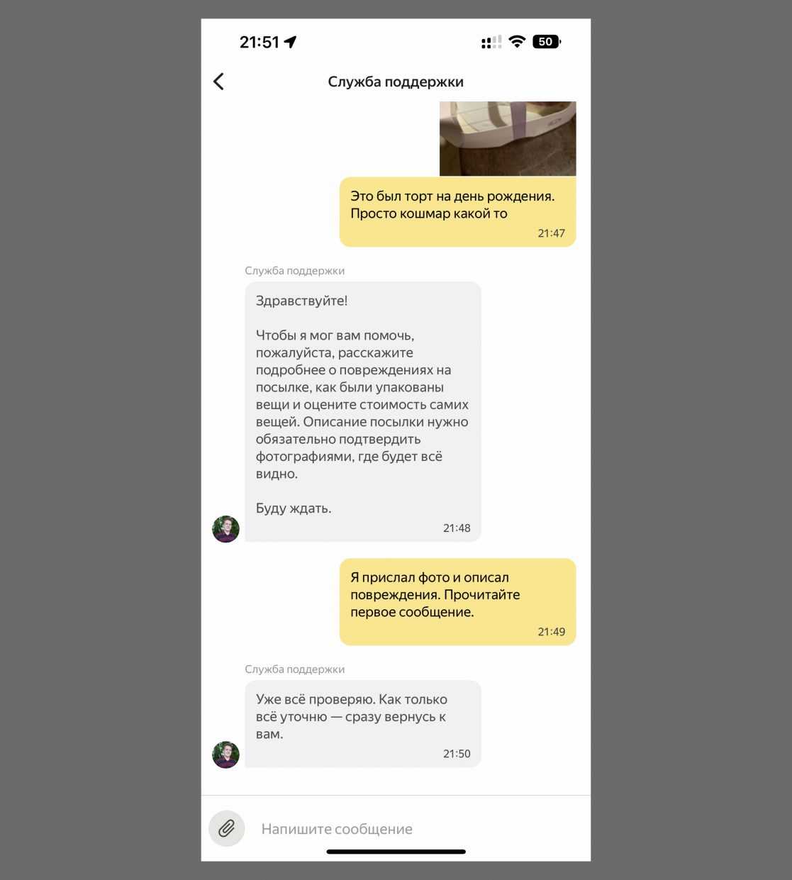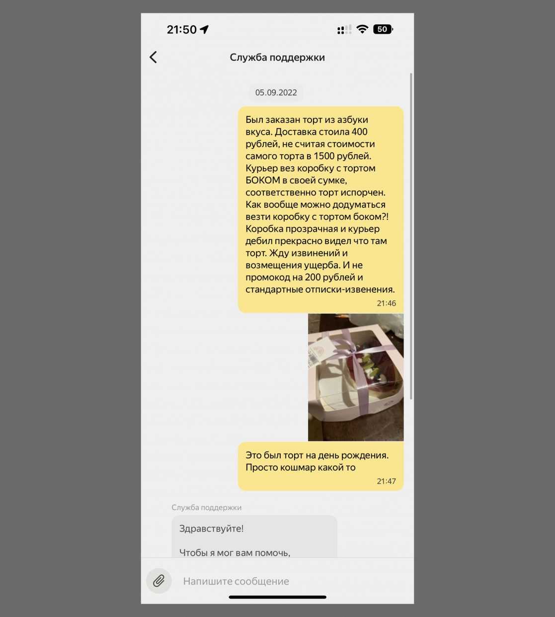 В итоге, торт полностью потерял товарный вид, гости требуют сладкого к чаю, знакомая спрашивает, понравился ли её подарок и вкусный ли он, курьера и след простыл, а я начинаю писать в техподдержку Яндекса, пытаясь разобраться в этой ситуации.