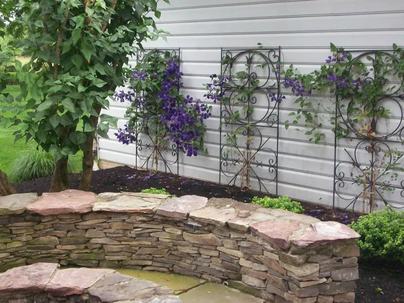 Также клематисы можно высаживать рядом с деревьями и другими кустарниками, но при этом нужно следить за корневой системой всех растений, чтобы не было проблем при росте. Хорошо цветы соседствуют с хвойными деревьями, грушей, акацией, бузиной и скумпией.