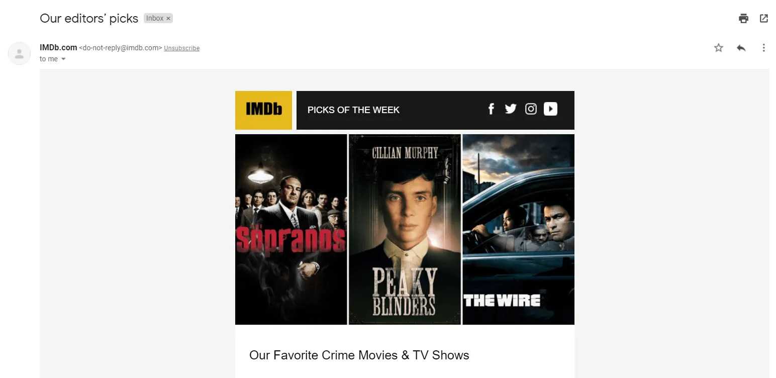 Одним из классических примеров являются сообщения о выборе редакторов iMDB, которые раз в две недели рассылаются всем пользователям. Этот вид маркетинга позволяет им поддерживать отношения с пользователями столько, сколько они пожелают.