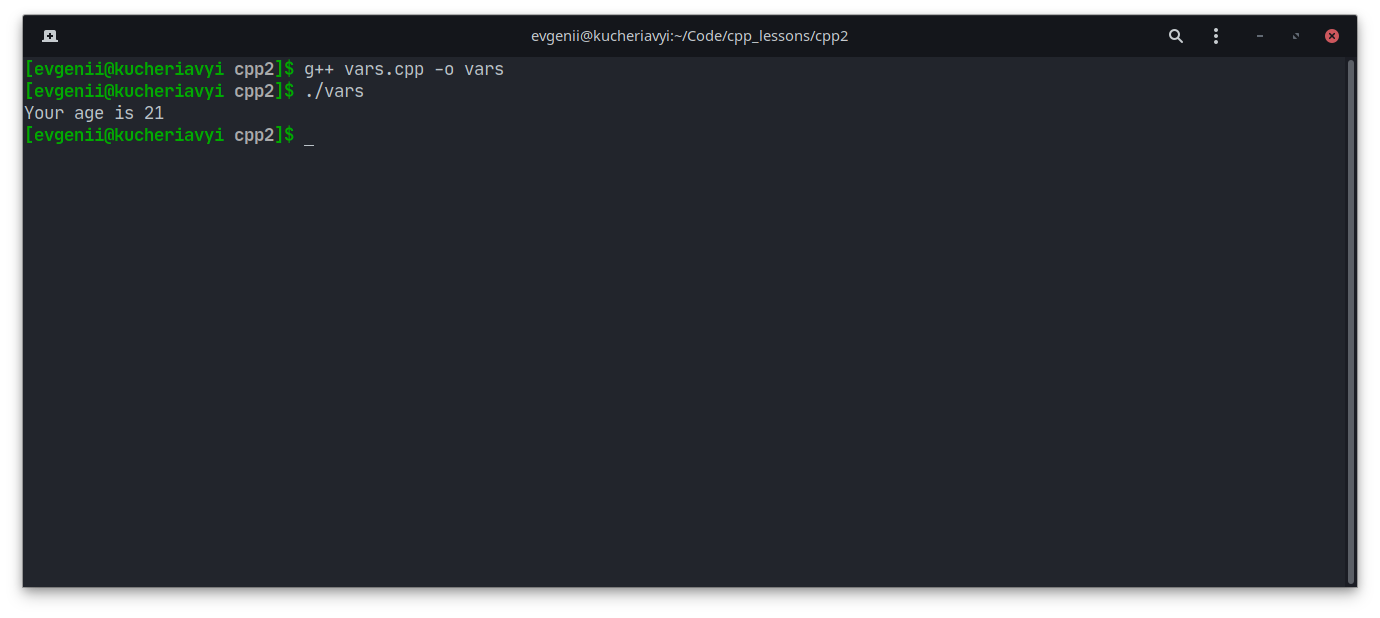 Для начала объявим переменную, то есть скажем компьютеру, что нам нужно занять место в памяти. Для этого укажем тип данных, а потом название переменной.