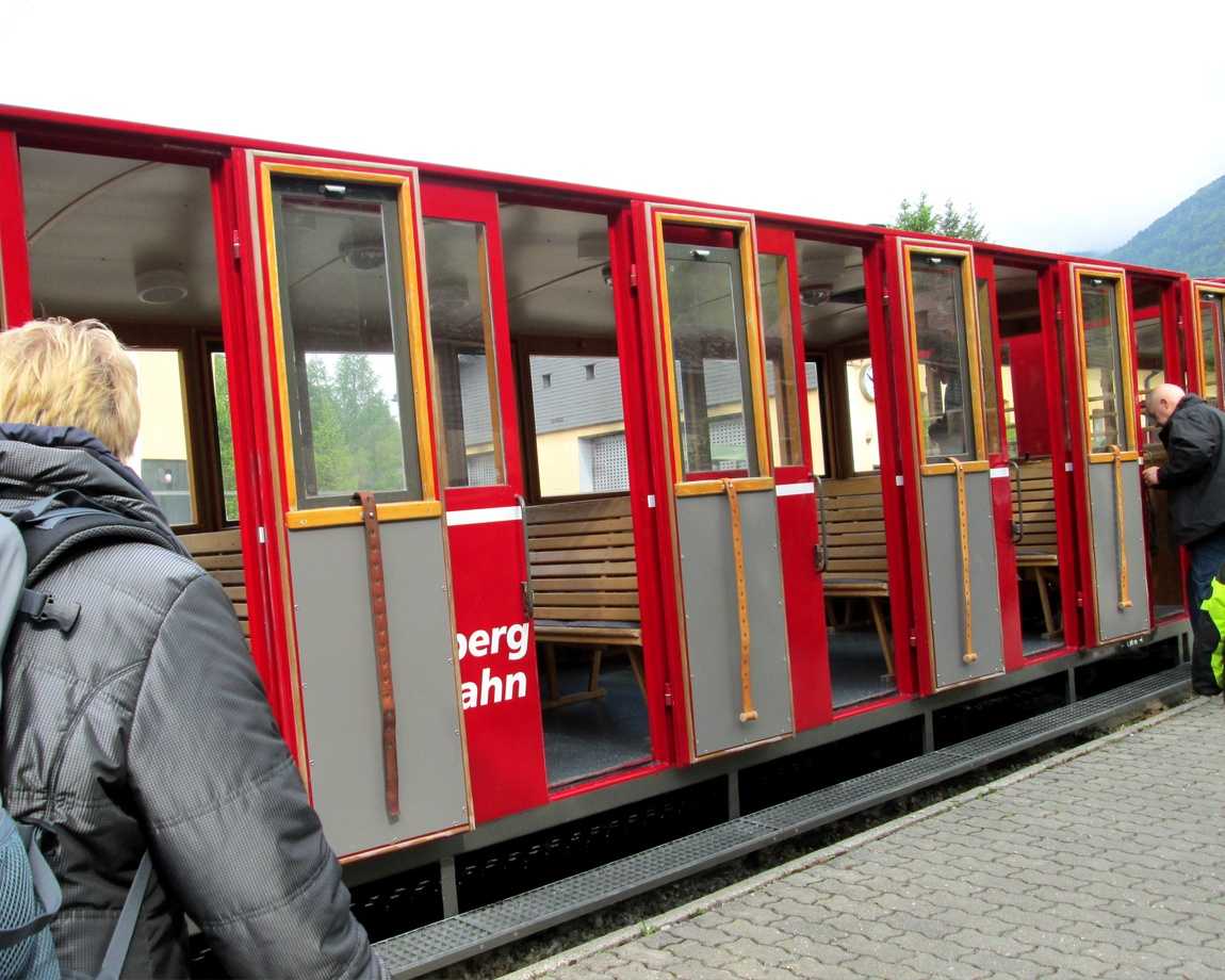 Вагон небольшой, и он один. Садимся плотно по 4 человека в ряд. Локомотив у нашего поезда паровой, и он пыхтит прямо перед нами. Служащий закрывает за нами дверки в вагон, и паровоз трогается. Едем задом – наперёд, паровоз толкает перед собой вагон, двигаясь по узкоколейке. В нескольких местах уклон составляет 18%, то есть подъем на метр на протяжении 5,5 метров. Общий подъем – 927 метров. Чтобы забраться по таким крутым уклонам, используется зубчатая планка, расположенная между рельсами, за которую цепляется среднее зубчатое колесо локомотива. Довольно быстро с небольшими рывками поднимаемся в гору.