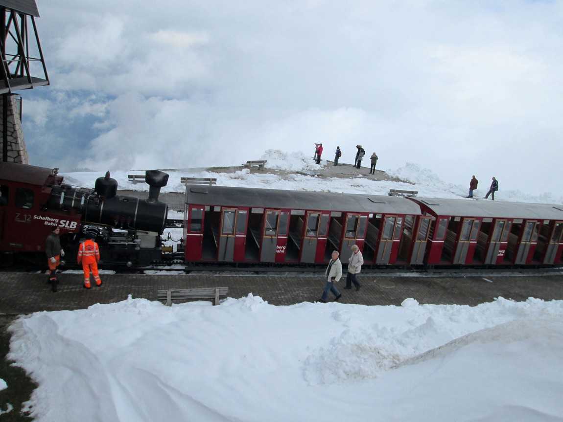 Гора Шлафберг — в переводе Овечья гора. Состав всего 3 вагона. Сзади такого маленького состава едет локомотив, который толкает перед собой вагоны. Вместо рельсов находятся зубцы, за которые цепляются колёса, и от этого вагончики потряхивает. Наверху лежит снег, который расчищает трактор. Снег настолько белый, что казался с голубым оттенком.