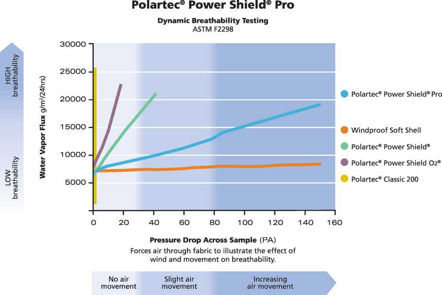 Как видим, динамические показатели дышимости PowerShield O2 заметно выше всех остальных софтшелов фирмы polartec.