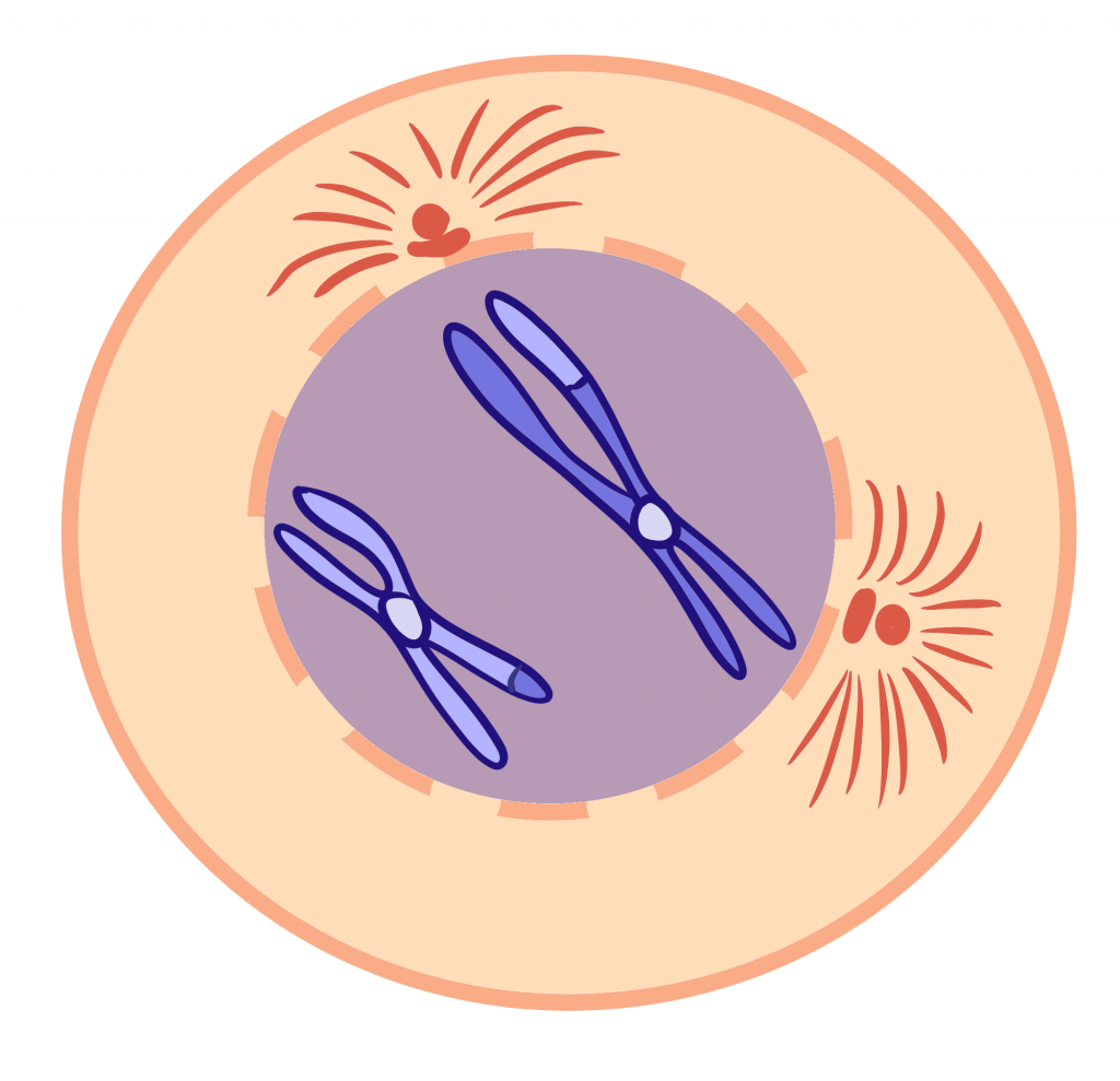 В течение жизни клетки механизм ядерного деления разрушает часть ядра клетки. Клеточная ДНК дублируется перед делением ядра. Строительные элементы ядра, включая ядерную оболочку и пластинку, затем постепенно разрушаются, и ядрышко в конечном итоге исчезает. Затем гомологичные хромосомы делятся на два полюса.