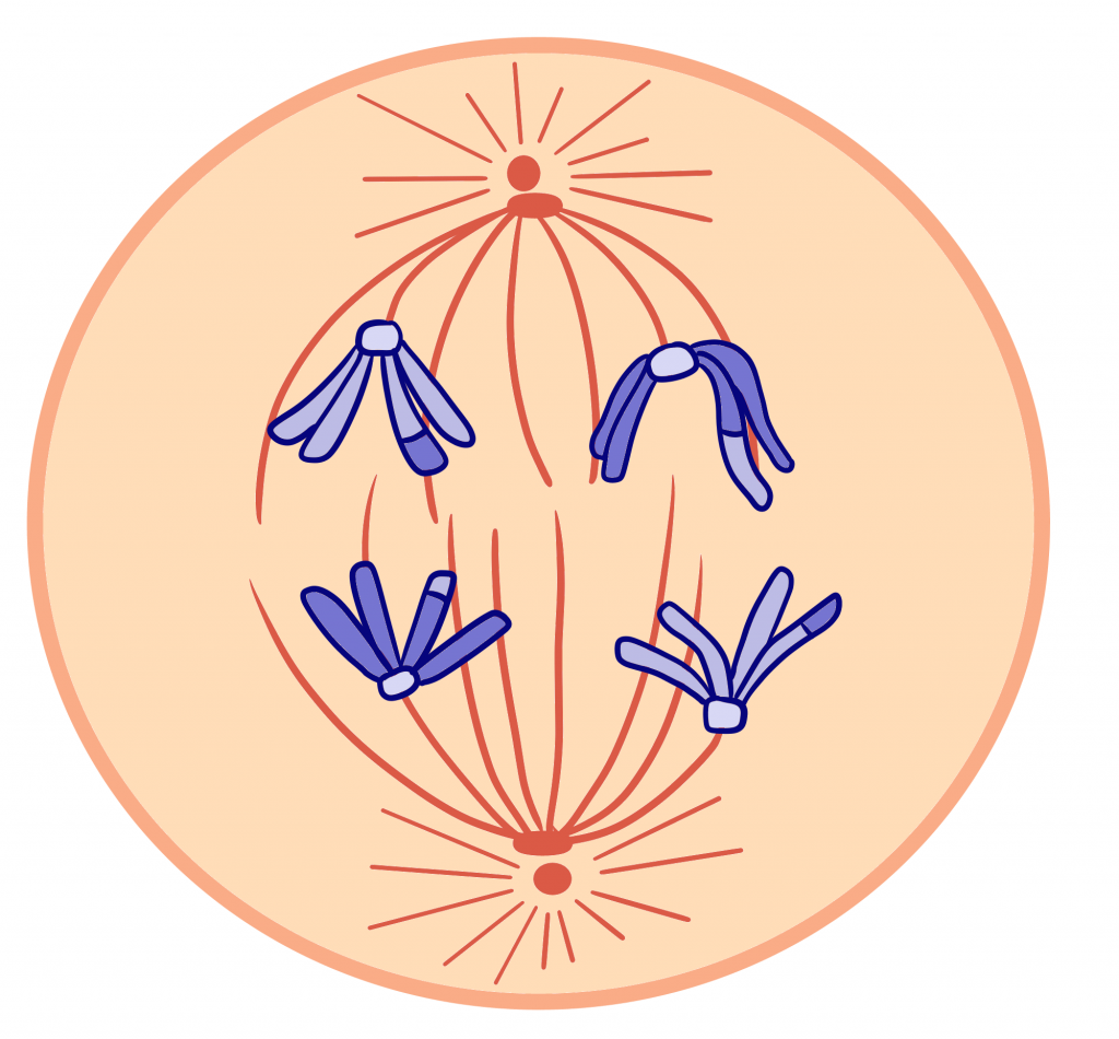 Нити веретена деления делят двухроматидные хромосомы на две однохроматидные хромосомы. Дочерние хромосомы расходятся по полюсам клетки. В итоге из каждой хромосомы образовались 2 новые, при этом количество ДНК не поменялось.Хромосомный набор у каждого полюса — 1n1c, в клетке — 2n2c. |