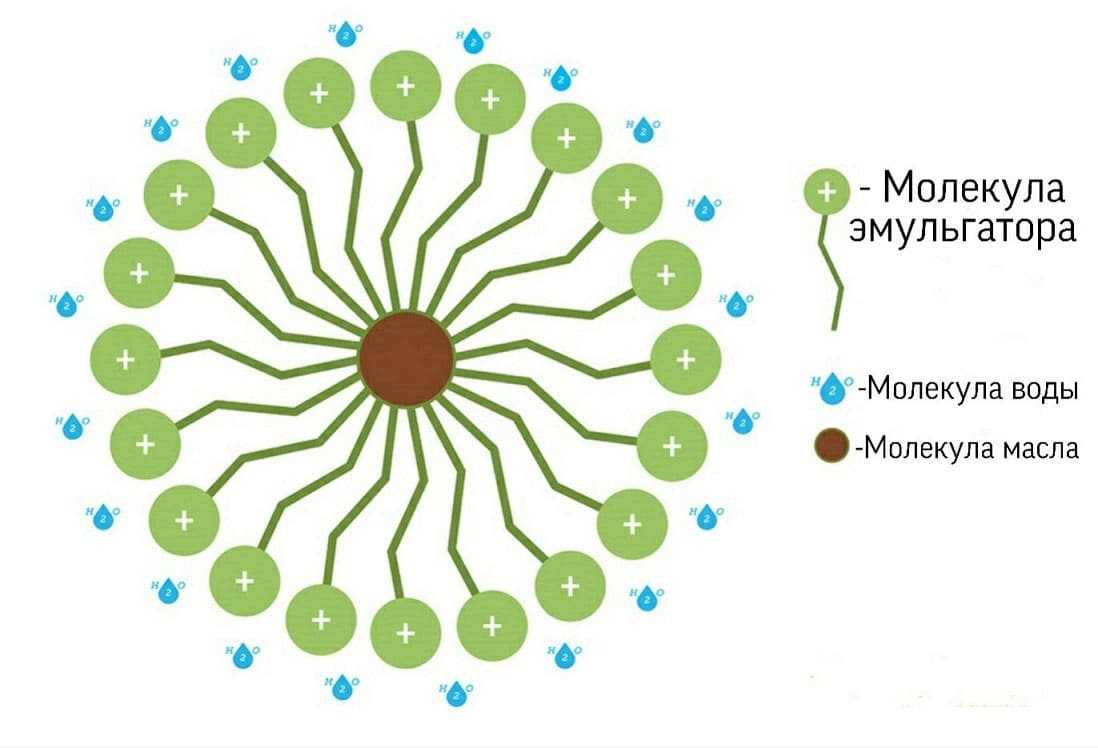 Эмульгаторы — вещества, способные образовывать эмульсии их двух несмешивающихся жидкостей путем образования вокруг частиц одной из жидкостей сферу из химических молекул, растворимых во второй жидкости. Наглядно можно увидеть на картинке.
