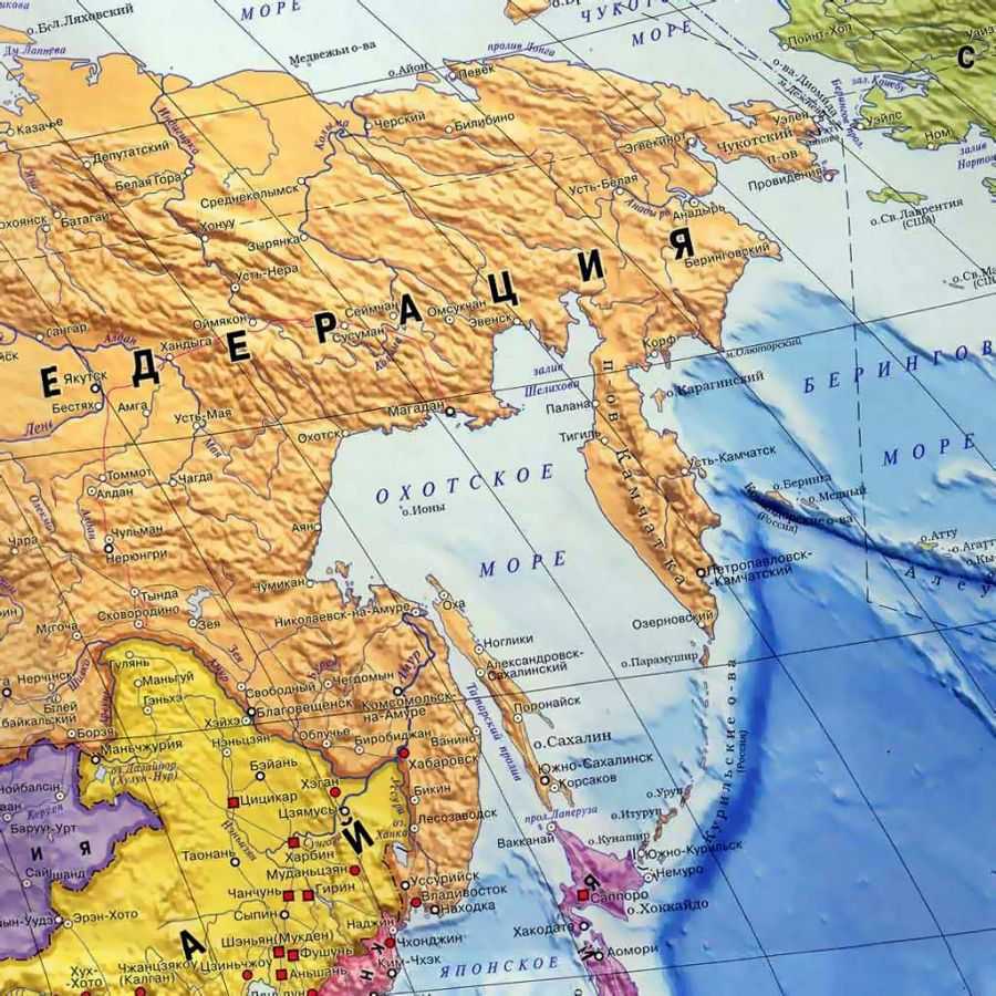 - Охотское — занимает площадь 1 млн 600 тысяч кв. километров. Оно омывает Камчатку, его граница проходит через гряду Курильских островов и японский остров Хоккайдо.