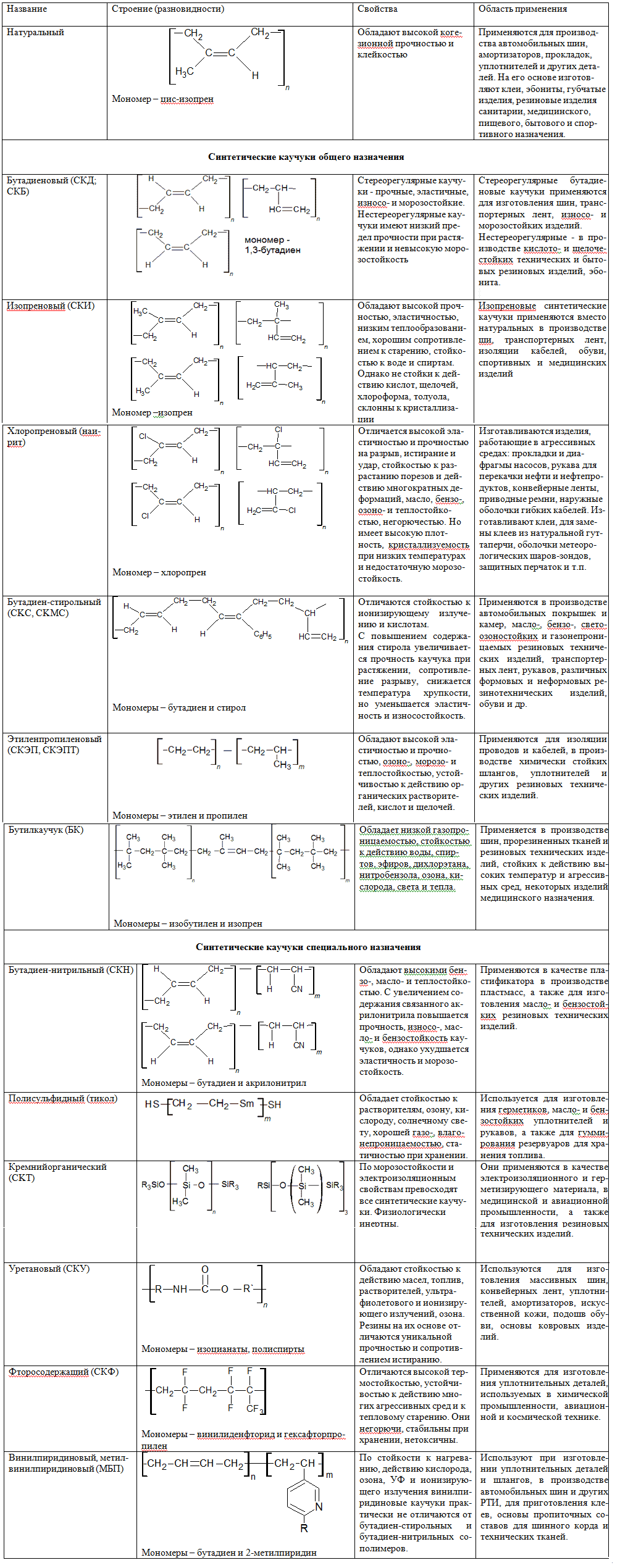 Сравнительные свойства и области применения каучуков приведены в таблице ниже. Некоторые из каучуков описаны в разделе Свойства и получение алкадиена: