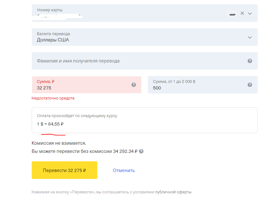 Если переводить 100 000₽, то эта сумма конвертируется в $1 549 по курсу 64.55₽.