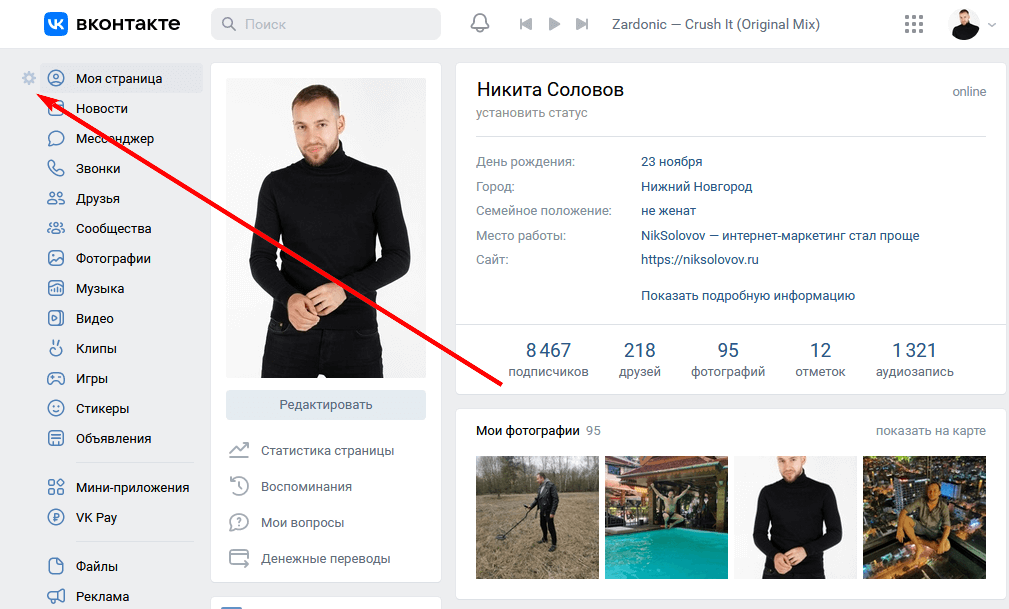 Но теперь вам нужно навести курсор на слова «Моя страница» и слева от них появится символ настроек — шестеренка, нажмите на него.