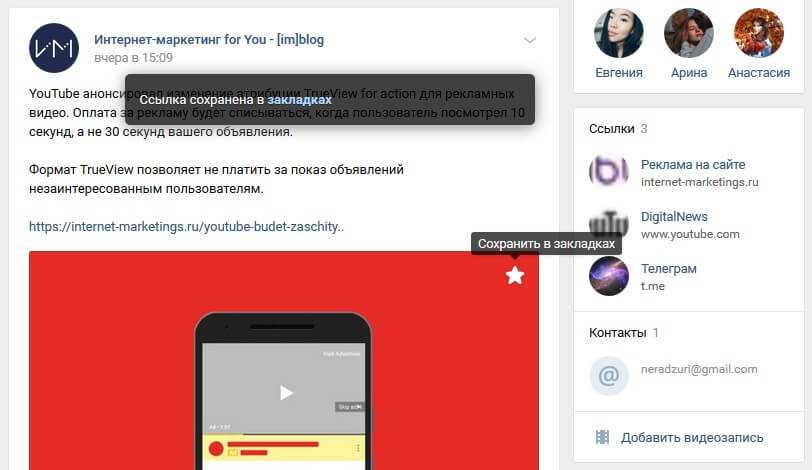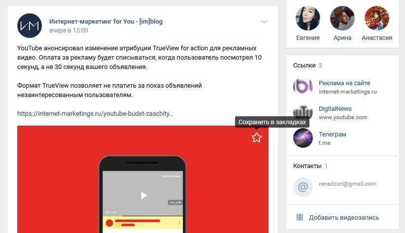 Для сохранения нужного материала необходимо нажать на звездочку в посте или на кнопку «Сохранить как закладки» в меню опубликованного поста.