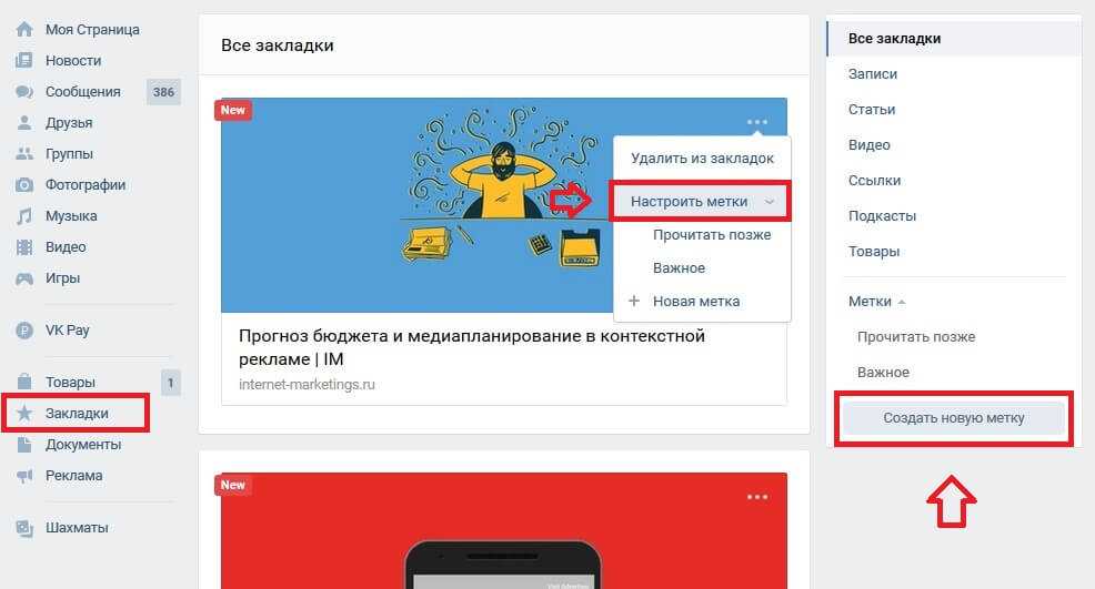 Чтобы создать тег, нажмите на три точки рядом с сохраненным постом или в меню справа нажмите на большую кнопку «Создать новый тег».