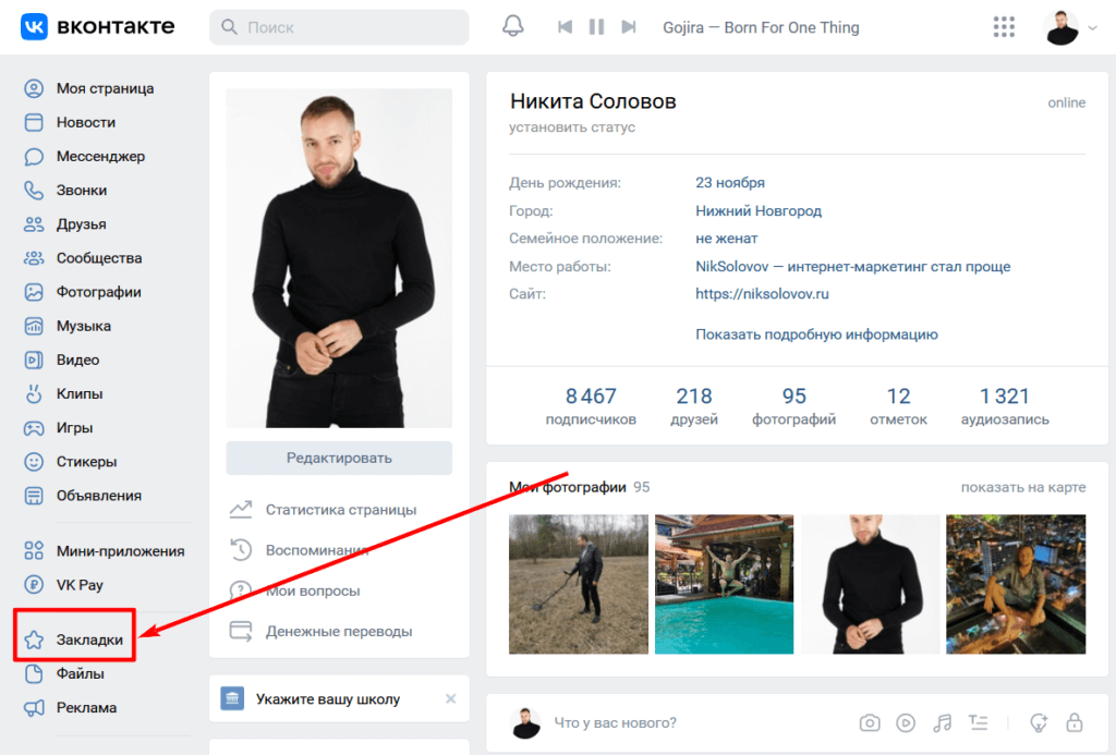 Начнем с того, что если вы ищете раздел «Закладки» в компьютерной версии ВКонтакте, то крайне вероятно, что вы не сможете его найти.