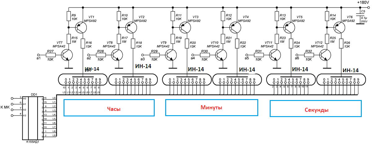 Эта схема решает проблему согласования управляющего напряжения на микросхеме 5 В и управляемого напряжения питания анодов. Положительный потенциал 180 В подается на анод, а отрицательный – на катоды соответствующих цифр.