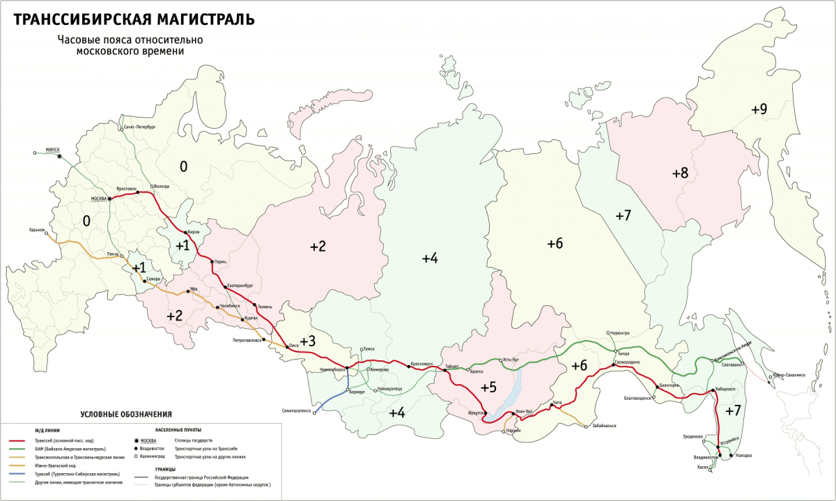 Транссибирская магистраль — крупнейшая в мире железная дорога (протяженность — 9288 км). Магистраль соединяет европейскую часть России с Сибирью и Дальним Востоком. Транссиб начинается в Москве на Ярославском вокзале и кончается во Владивостоке (хотя собственно Транссибом может называться лишь восточная часть магистрали, от Челябинска до Владивостока). Эта железная дорога была построена в 1891-1916 гг. Трасса проложена в непроходимой тайге, на болотах, в зонах вечной мерзлоты; она проходит через 89 городов, преодолевает 16 больших рек и находится в 7 часовых поясах. Путешествие продолжается 8 с половиной суток. Магистраль строили в основном солдаты и заключенные, причем в довольно быстром темпе (5-6 км в день).