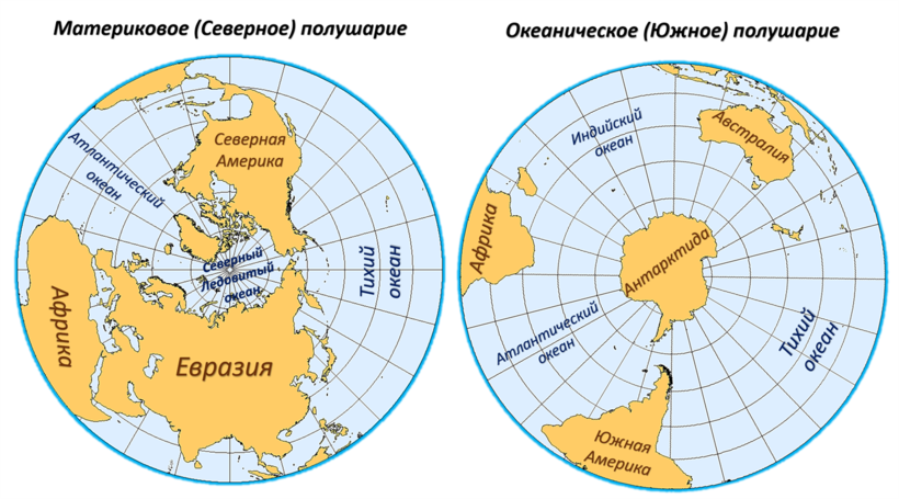 В северной части земного шара расположено больше суши, а в южной господствует океан. Напомню о материках, которые разместились в Северном полушарии.