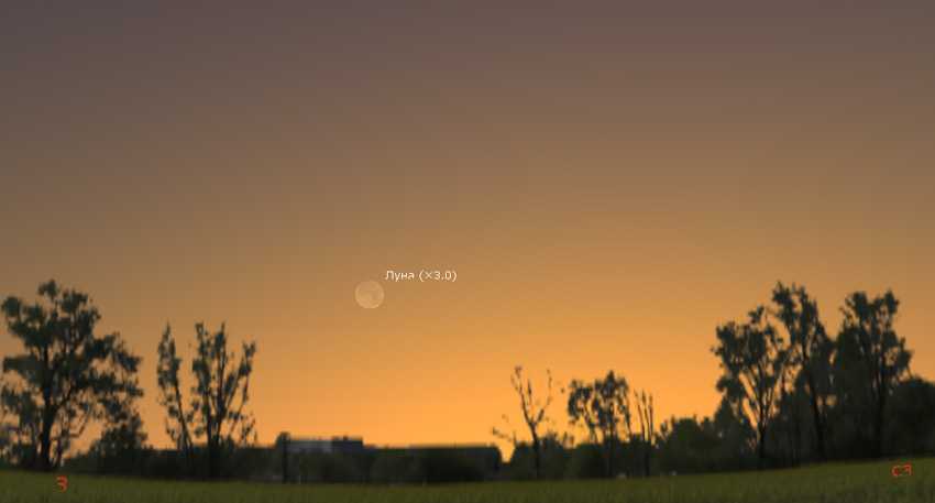 - Через 20 – 30 минут после захода Солнца начать внимательно осматривать небо в западном направлении. Луна будет находиться над тем местом, где зашло Солнце, на высоте 8 — 15 градусов над горизонтом в зависимости от вашего местонахождения (средняя полоса или юг России).