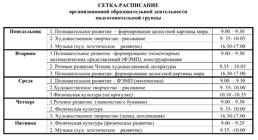 Возраст в группах и расписание занятий