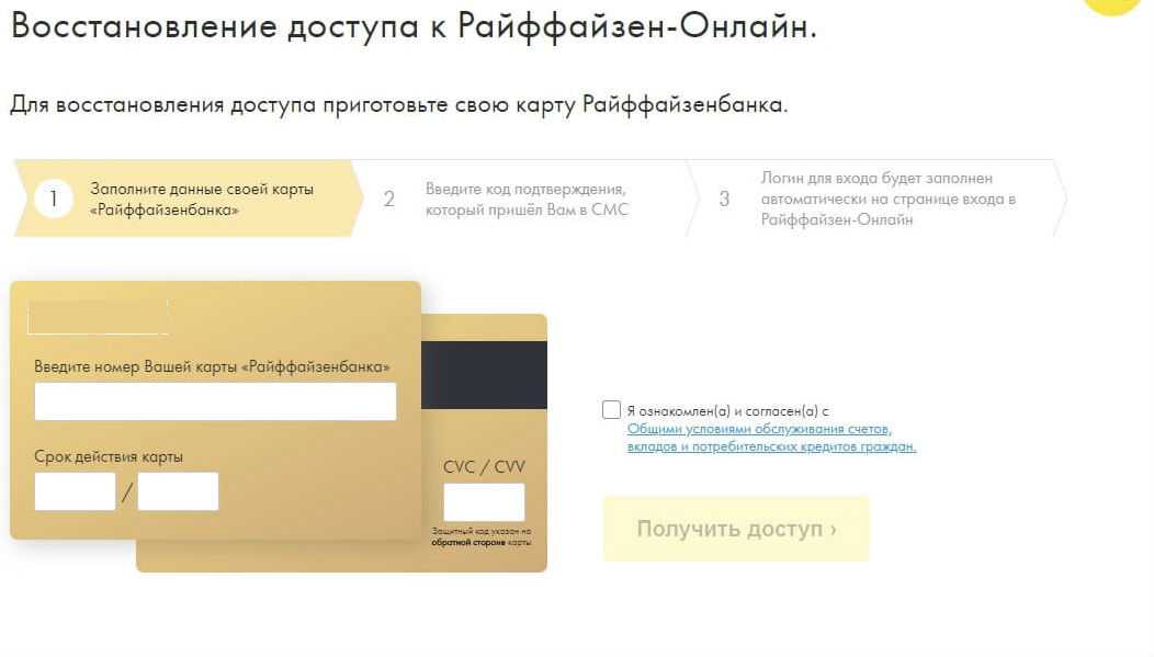 Если у вас нет карты Райффайзенбанка, пожалуйста, обратитесь на нашу бесплатную телефонную линию по номеру 8-800-700-00-72 (пункт голосового меню 3). Для восстановления доступа потребуются ваши паспортные данные и кодовое слово, указанное вами при заключении договора с банком.