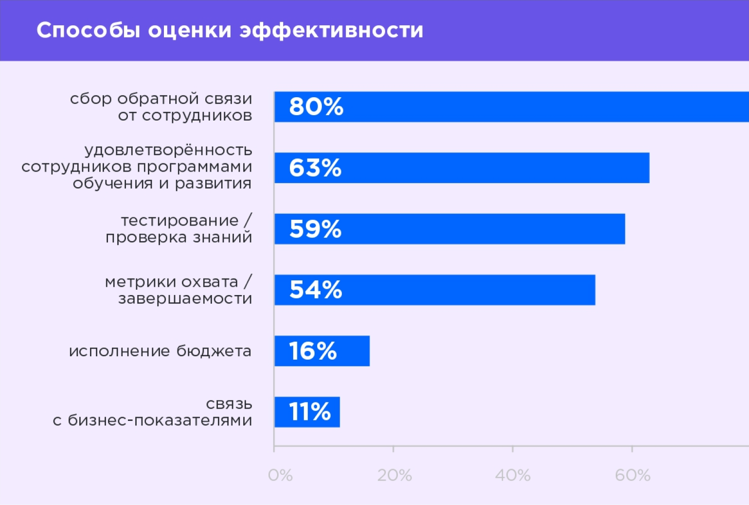 Отдельно авторы исследовали инструменты для оценки эффективности обучения. Картина получилась неоднозначная. С одной стороны, только 11% компаний замеряют связь с бизнес-показателями, то есть оценивают влияние обучения на выручку или выполнение поставленных задач. С другой стороны, наиболее популярные способы оценки эффективности — сбор обратной связи и замер удовлетворённости сотрудников.