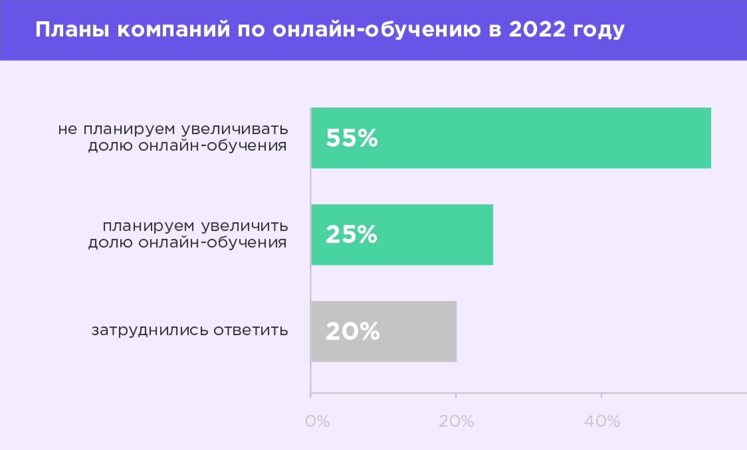 Порядка 10% компаний, наоборот, запланировали увеличить бюджеты. А половина опрошенных компаний бюджет не пересматривала — такой ответ был особенно актуален для малого бизнеса. В этой группе 60% компаний решили сохранить текущие расходы на обучение сотрудников.