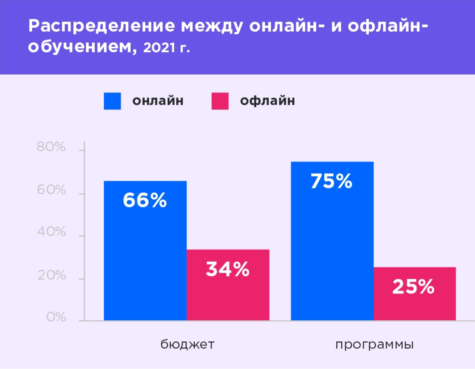 Что касается формы обучения, то здесь очевидны последствия пандемии — 75% корпоративных программ проводятся онлайн и отказываться от этого формата не собираются. На них же уходит и значительная доля бюджета — 66%. Только 25% опрошенных компаний планируют увеличить долю онлайн-обучения, но большинство (55%) собирается сохранить текущее положение вещей.
