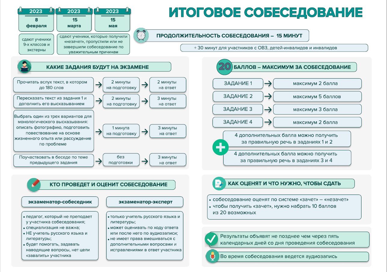 Выполнение всех заданий занимает около 15 минут, а максимальный балл за собеседование составляет 20 баллов. Для того, чтобы быть допущенным к сдаче основных экзаменов, нужно набрать как минимум половину — 10 баллов. В случае, если выпускник не набирает пороговый балл на собеседовании, у него есть ещё две попытки для пересдачи.