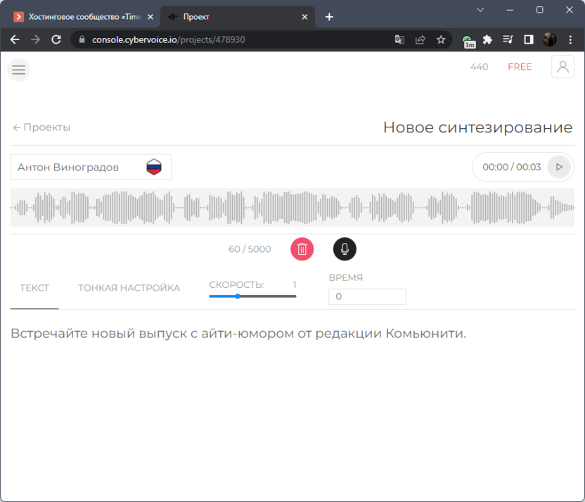 Сам редактор в личном кабинете Cybervoice тоже удобный, в нем есть большая область для работы с текстом и разделы для настройки озвучки. Единственным минусом этого сайта можно считать редкие зависания во время синтеза речи, но на эти случаи есть кнопка обновления процесса.