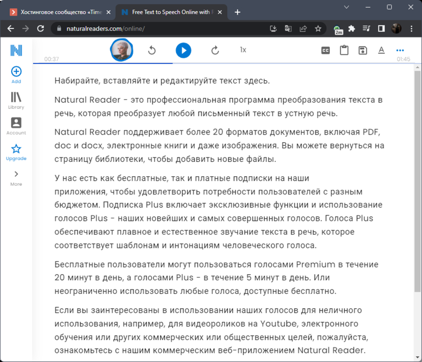 Первый сайт с названием NaturalReaders отлично подходит для озвучки сценариев или чтения книг. Пользователю достаточно выбрать одну из языковых моделей, вставить текст или загрузить его из документа в поддерживаемом формате. Бесплатно доступно только две языковые модели и 20 минут чтения текста в день, чего вполне достаточно для ознакомления с основными функциями онлайн-сервиса. Во время синтеза на экране могут появляться и субтитры по выбору пользователя, что позволит следить за текущим фрагментом и понимать, насколько качественно робот озвучивает содержимое.