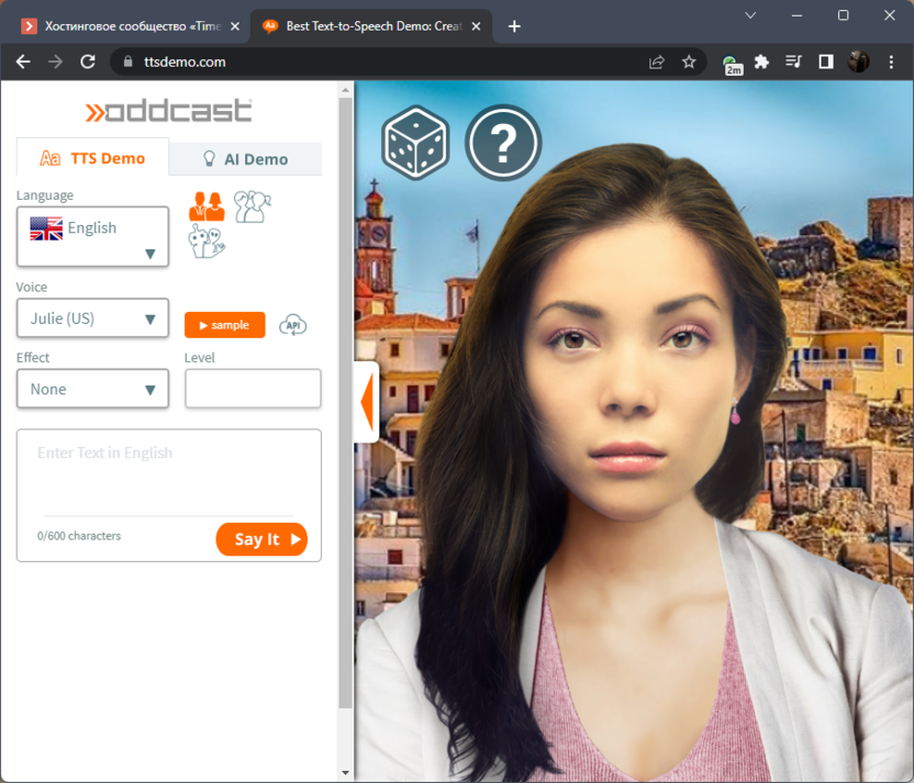 Онлайн-сервис Oddcast позиционируется как средство для создания дикторской речи с озвучкой разными голосовыми моделями. Помимо этого создается анимация, когда на экране виден сам диктор на фоне разных локаций, имитирующий ртом речь. Сейчас это выглядит немного несуразно и сразу можно понять, что картинка нереалистична, но стоит понимать, что ИИ в данной сфере только развивается и спустя некоторое время значительно усовершенствуется как в плане озвучки, так и графического сопровождения.