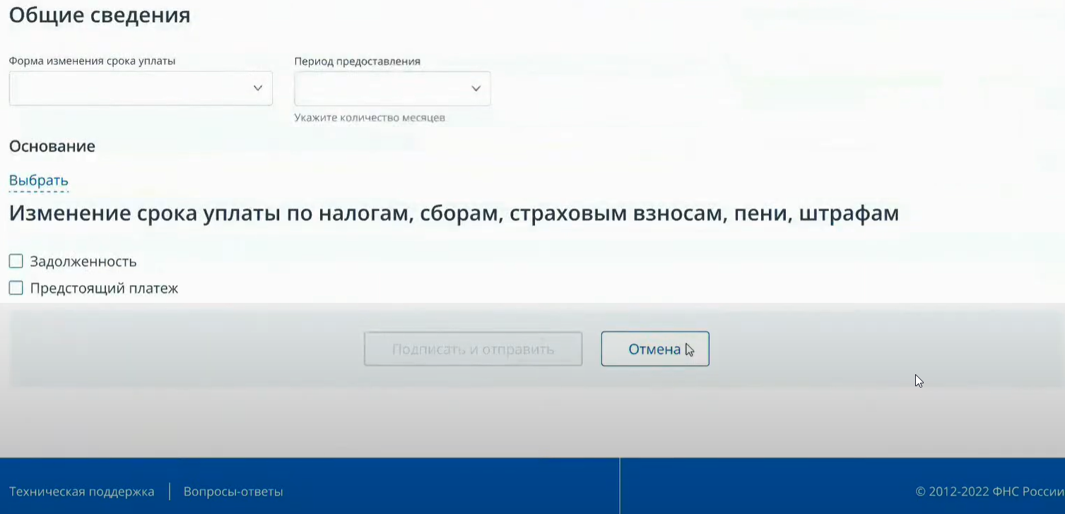 - Форму изменения срока уплаты и Период предоставления (месяцы).