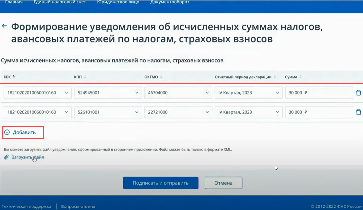 Необходимо заполнить реквизиты по кнопке Добавить и указать исчисленную сумму обязательства.
