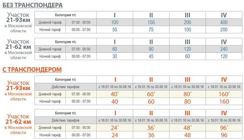 Примерное время в пути:Проезд без транспондераР В Москву Рабочие дниРуб 05:00 – 07:00 150 07:00 – 13:00 200 13:00 – 01:00 150 Выходные дни и праздники 05:00 – 01:00 150 из Москвы Рабочие дниРуб 05:00 – 16:00 150 16:00 – 22:00 200 22:00 – 01:00 150 Выходные дни и праздники 05:00 – 01:00 150 Проезд с транспондером *260Р В Москву Рабочие дниРуб 05:00 – 07:00 150 07:00 – 13:00 200 13:00 – 01:00 150 Выходные дни и праздники 05:00 – 01:00 150 из Москвы Рабочие дниРуб 05:00 – 16:00 150 16:00 – 22:00 200 22:00 – 01:00 150 Выходные дни и праздники 05:00 – 01:00 150 Распечатать—>