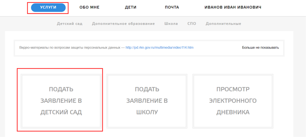Чтобы поставить ребенка на очередь в детский сад, следует перейти в раздел «Услуги» личного кабинета на сайте . После этого нужно нажать на вкладку «Подать заявление в детский сад».
