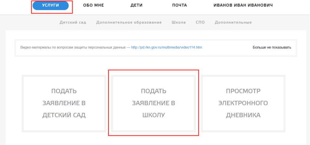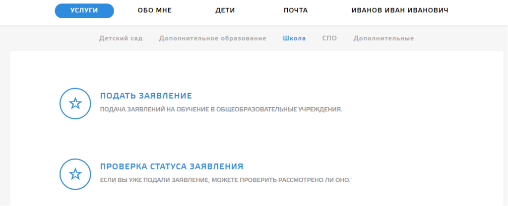 Нужно перейти в раздел «Услуги» личного кабинета граждан Кемеровской области и нажать на вкладку «Подать заявление в школу».