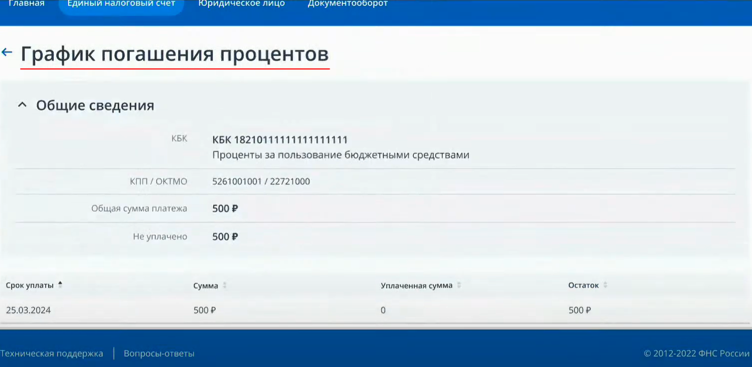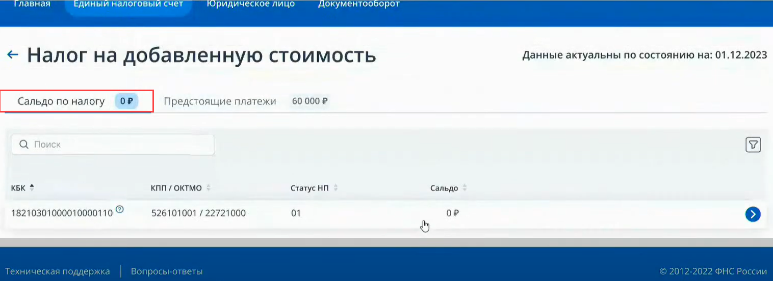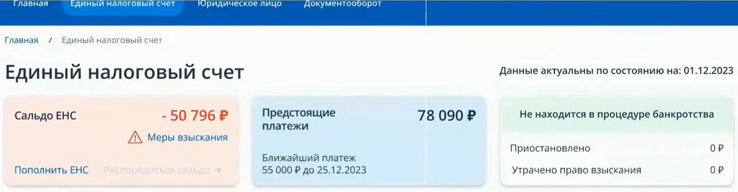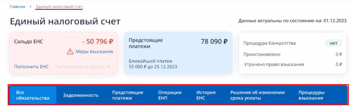 В интерфейсе ЕНС в ЛК ЮЛ на вкладке Единый налоговый счет можно просмотреть сведения о состоянии единого налогового счета.