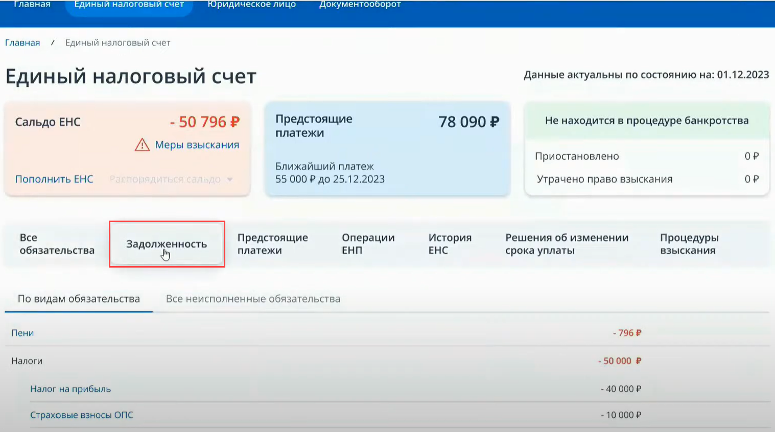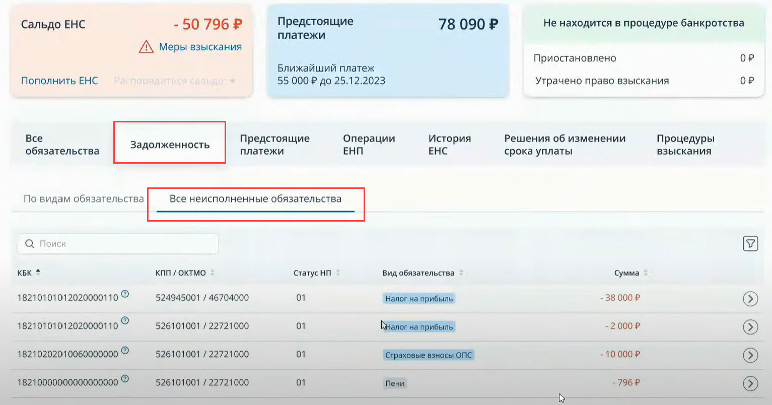 С главной страницы интерфейса ЕНС можно перейти к информации об обязательствах, формирующих задолженность — на вкладку Задолженность. Здесь дается информация по сальдо с отрицательной суммой.