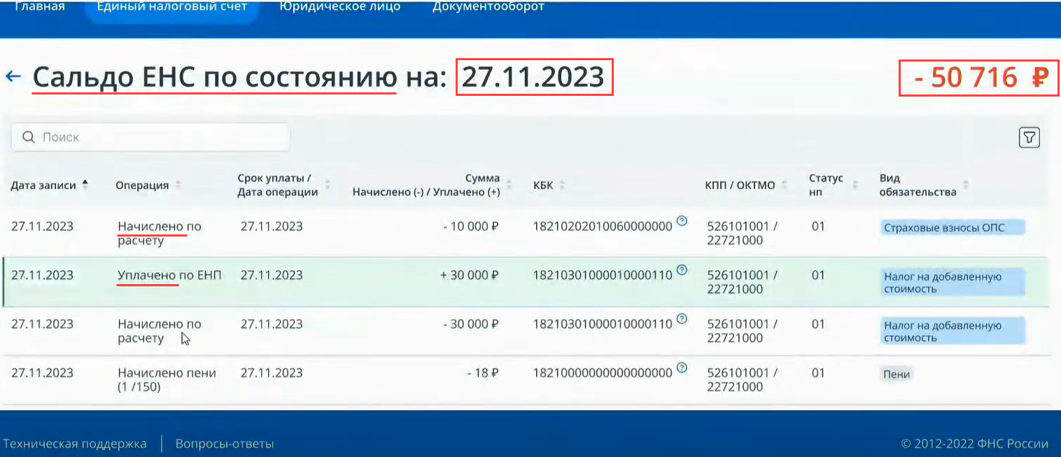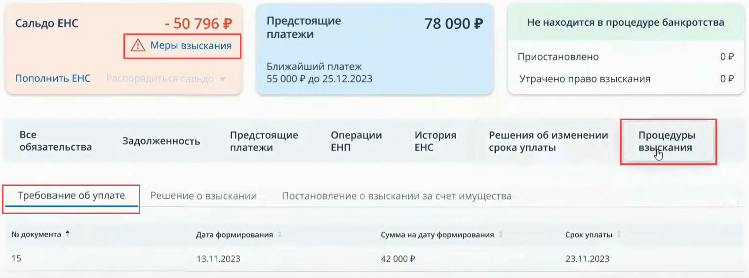 Маркер процедуры взыскания также отражается и в блоке Сальдо ЕНС.
