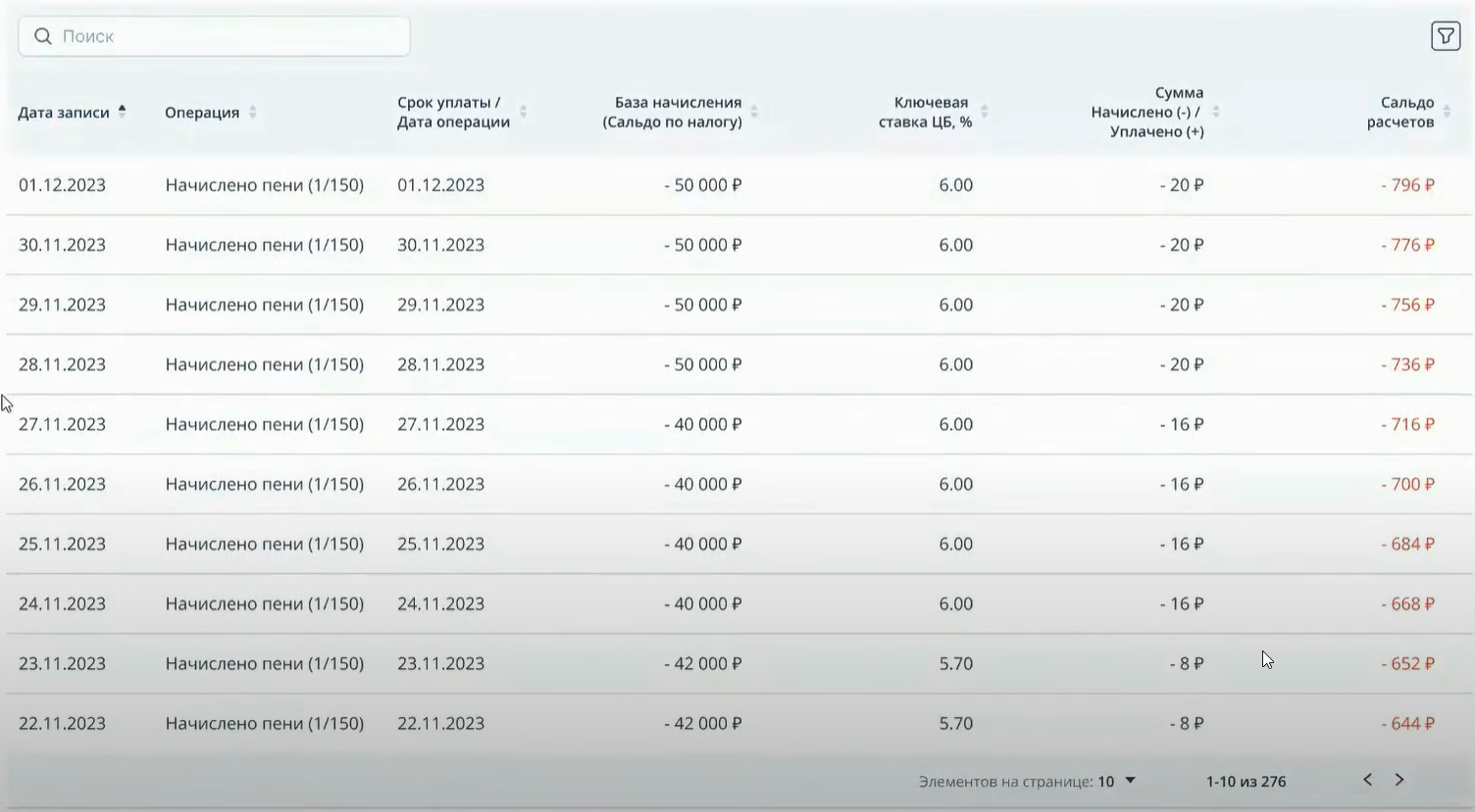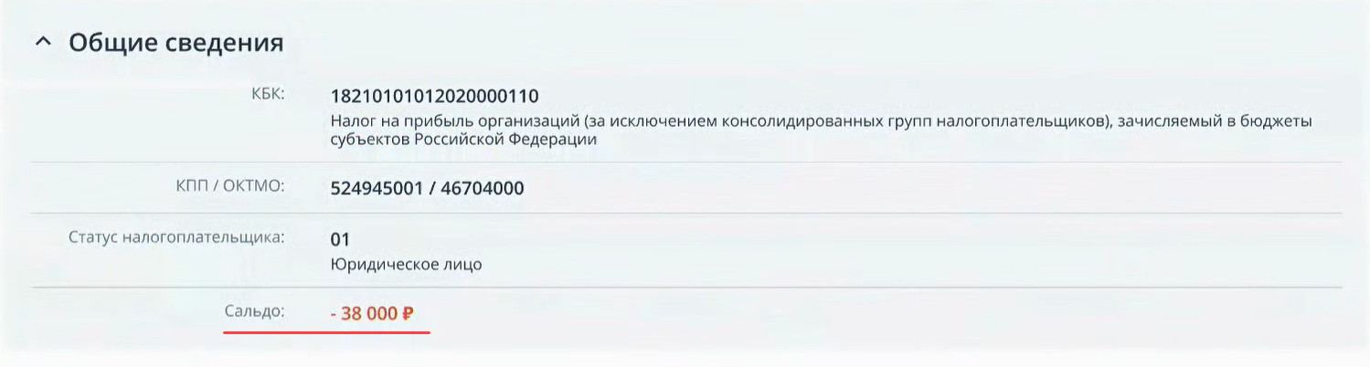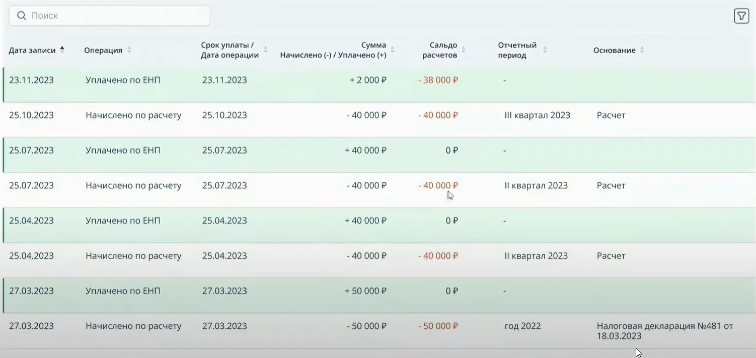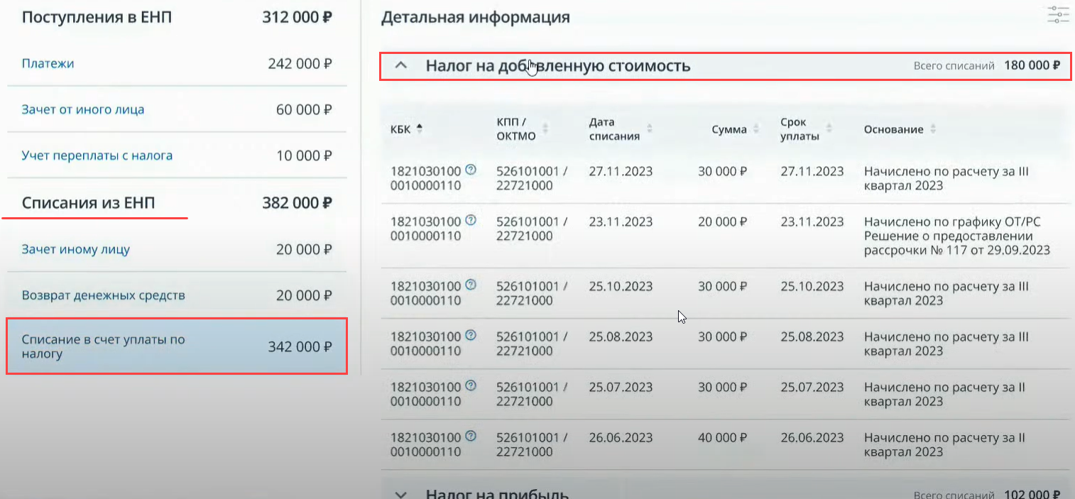 На отдельных вкладках отражается детализированная информация о состоянии расчетов налогоплательщика.