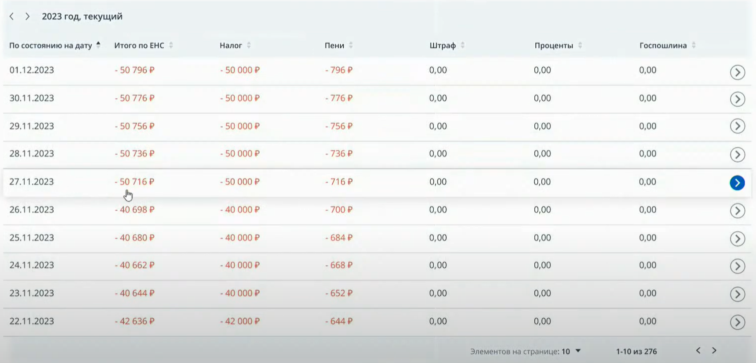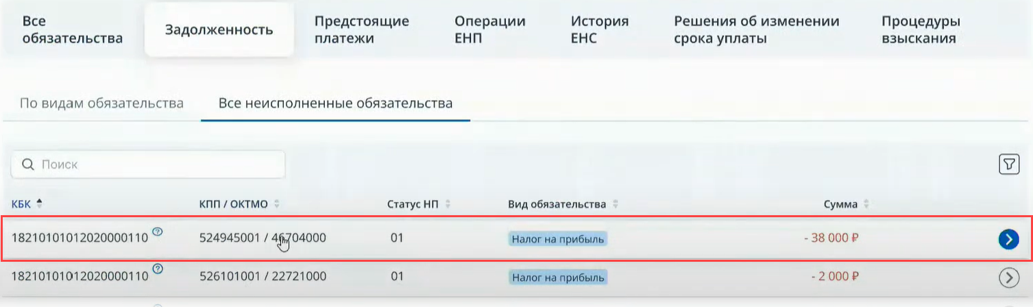 Также задолженность можно посмотреть в виде списка всех неисполненных обязательств в разрезе: