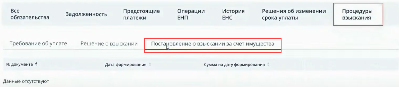 С главной страницы интерфейса ЕНС можно перейти к списку Процедуры взыскания. Далее посмотреть информацию в разрезе сформированных: