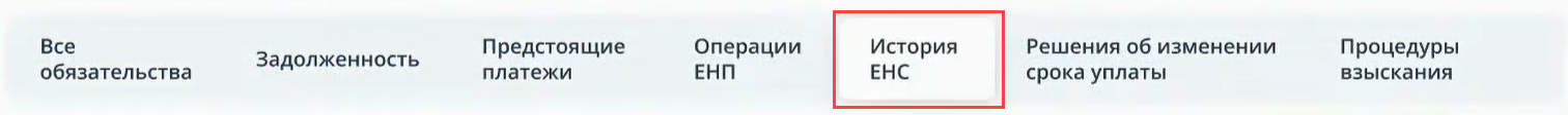 С главной страницы интерфейса ЕНС доступна информация об истории изменения сальдо ЕНС на вкладке История ЕНС. В хронологическом порядке (по состоянию на дату) отображается история изменения суммы на ЕНС.