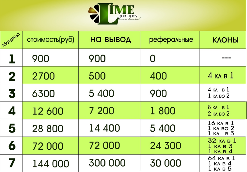 1 матрица-900₽2 матрица– 500₽, зависит от количества приглашённых3 матрица– 5400₽ + реферальные, сумма зависит от активности4 матрица – 7200₽ + реферальные, сумма зависит от активности5 матрица – 14400₽+ реферальные, сумма зависит от активности6 матрица– 72000₽ + реферальные, сумма зависит от активности7 матрица– 300 000₽+ реферальные, сумма зависит от активности