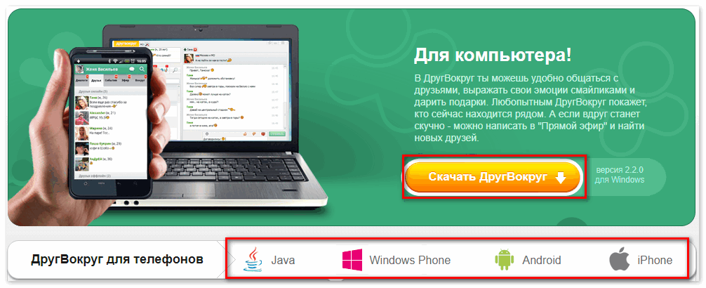 Мессенджер рассчитан под все версии Windows и операционные системы Android, iOS, Win Phone. Друг Вокруг можно скачать даже на простой кнопочный телефон. У программы есть версия Java, которая поддерживается старыми моделями мобильных.