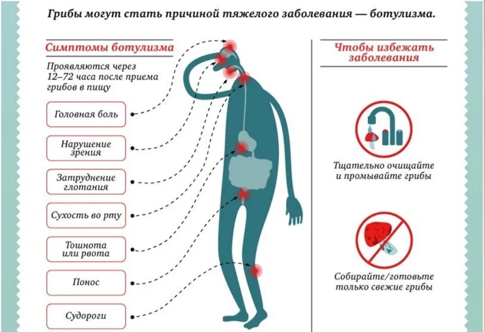 - Ботулизм: Одним из самых опасных осложнений отравления грибами является ботулизм. Это редкое, но крайне серьезное заболевание, вызываемое токсинами ботулизма. Симптомы могут включать паралич мышц, затруднение дыхания и даже смерть. Ботулизм может быть связан с определенными видами грибов, такими как мухомор пантерный (Amanita pantherina).
