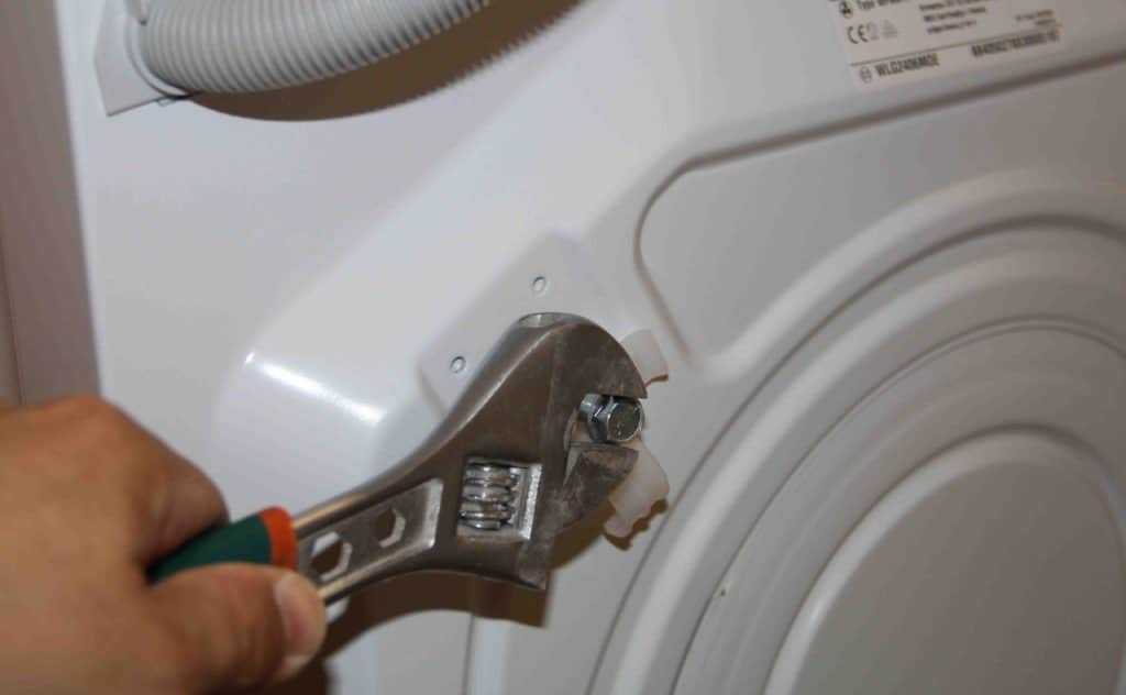 - Проверяют заднюю часть машины на отсутствие транспортировочных болтов. Их устанавливают перед перевозкой прибора, чтобы защитить от повреждения внутренние детали. Но после установки и запуска они вызывают сильную вибрацию, приводящую СМА к поломке.