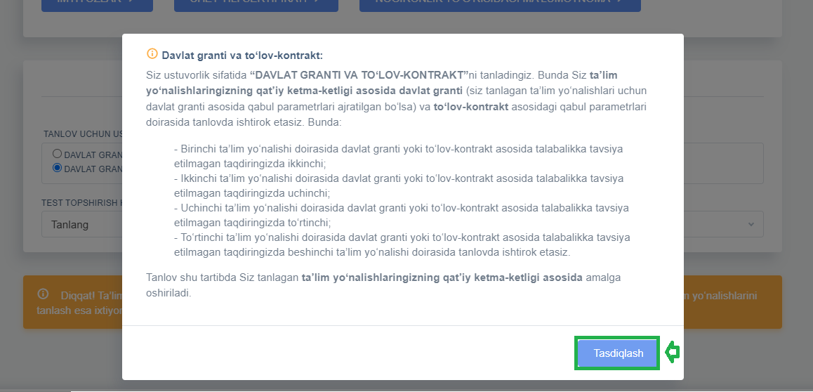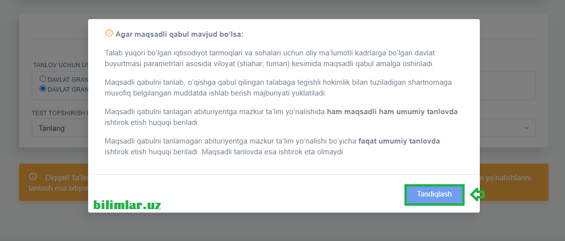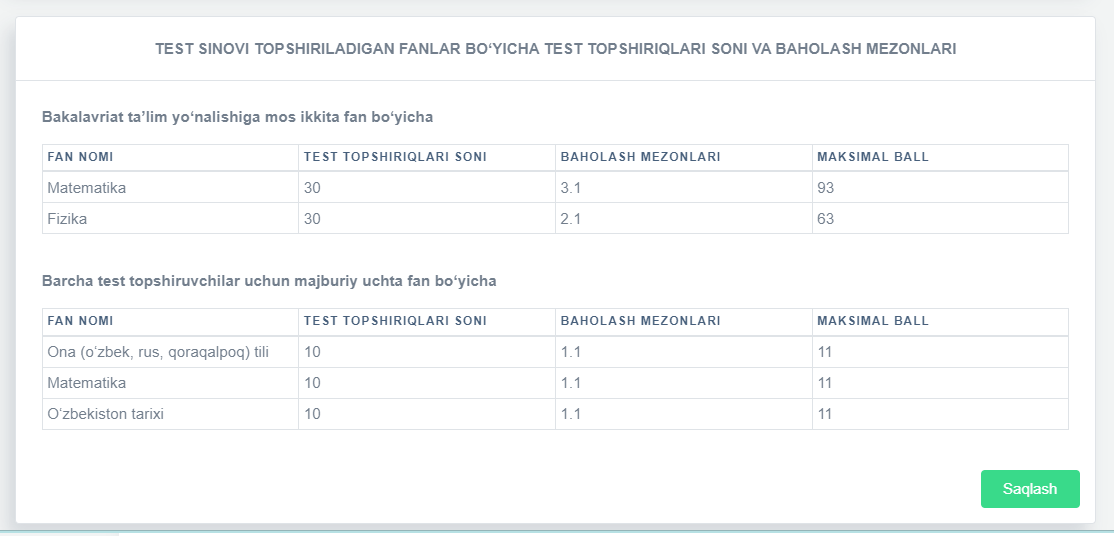 Shundan so’ng kerakli ta;lim yo’nalishlarni ta’lim shaklini tanlab bo’lganimizdan keyin TEST SINOVI TOPSHIRILADIGAN FANLAR BO‘YICHA TEST TOPSHIRIQLARI SONI VA BAHOLASH MEZONLARI chiqadi va tanishib chiqib saqlash tugmasini bosamiz.