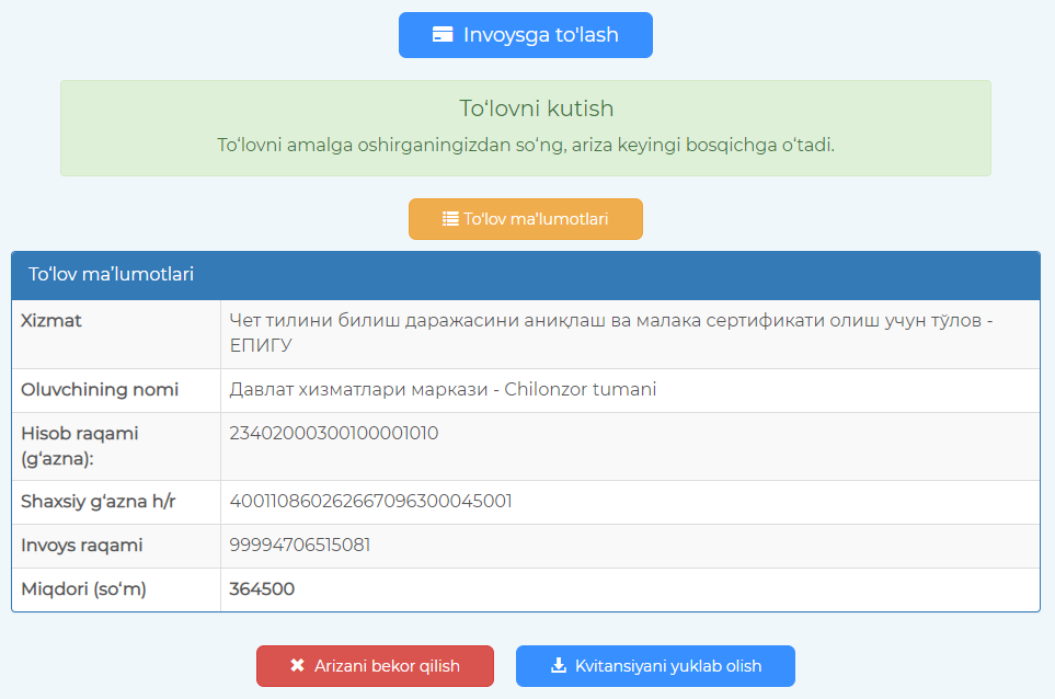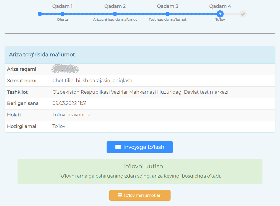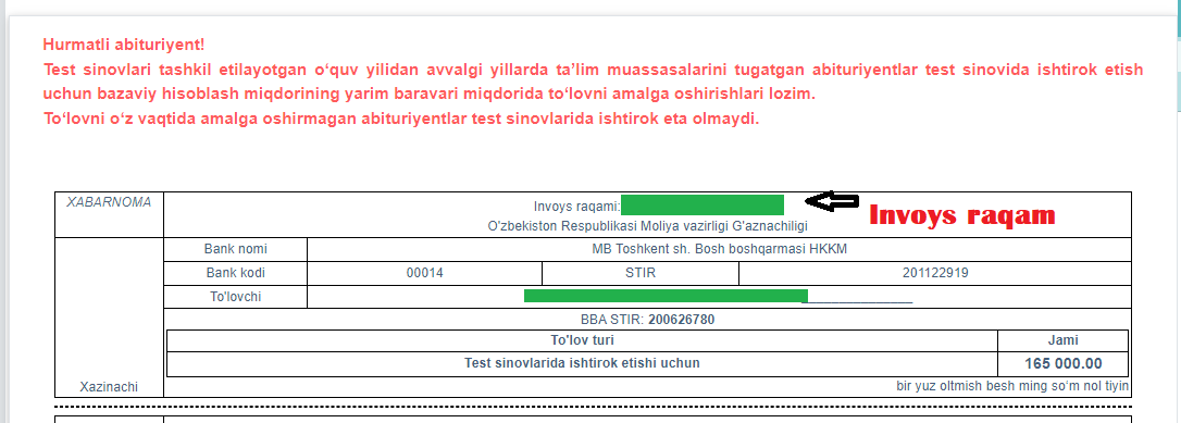 Ma’lumotlar tasdiqlanganidan so’ng abituriyentning qayd varaqasi shakllanadi. Abituriyentning qayd varaqasining quyi qismida test sinovi uchun to’lovni amalga oshirish uchun invoys raqam hosil bo’ladi va shu invoys raqamga to’lovni amalga oshirish bilan ro’yxatdan o’tish yakunlanadi.