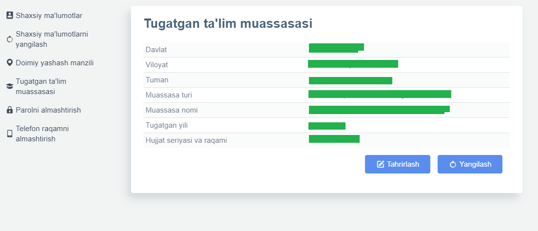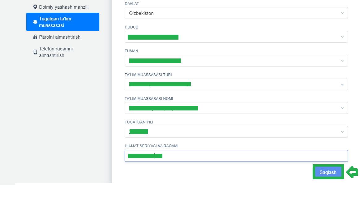 keyingi oynaga menyudan tugatgan ta’lim muassasasi bosiladi va tugatgan ta’lim muassasasi tanlanadi, unda muassasa turi, davlat, viloyati, muassasa, tamomlagan yili tanlanadi qolgan seriyasi va raqami yoziladi saqlash tugmasi bosiladi.